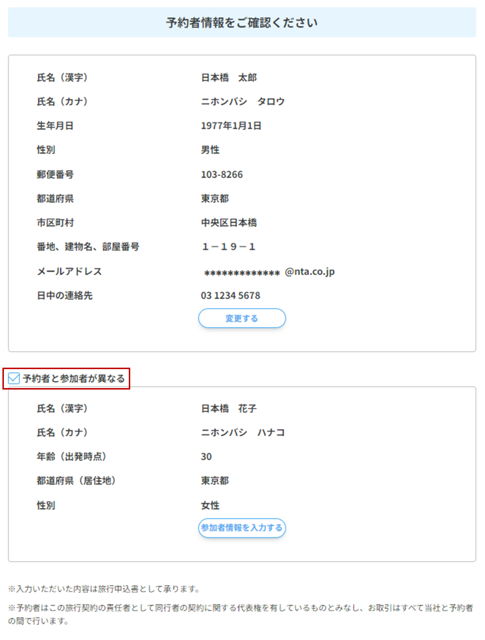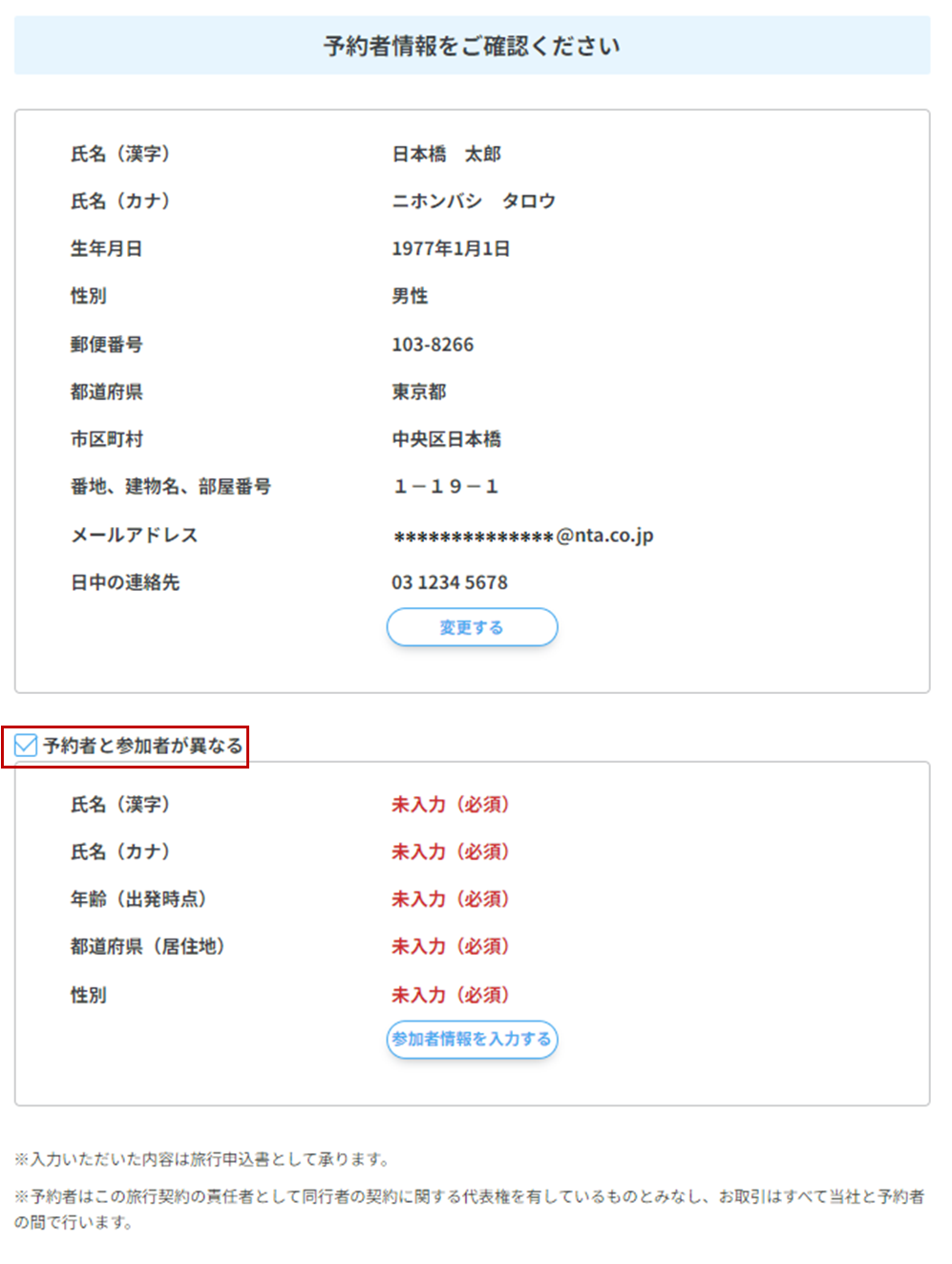 「予約者と参加者が異なる」にチェックすれば参加者情報の入力が可能となります。